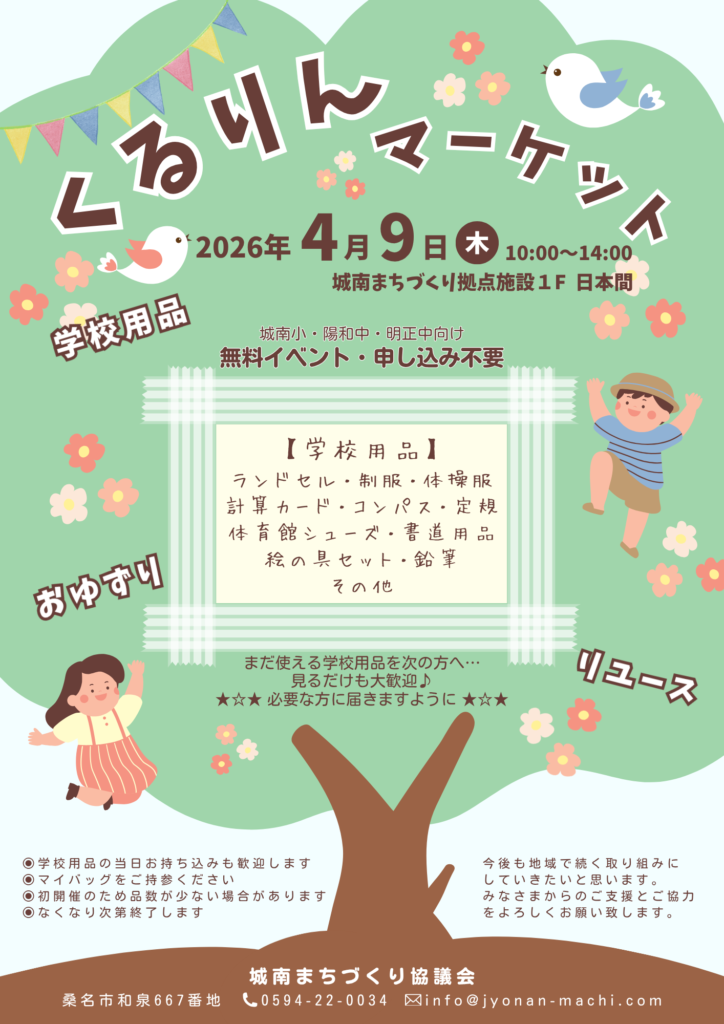 桑名市内小中学校の入学式の日に、学校用品の譲渡会【くるりんマーケット】を開催しました。